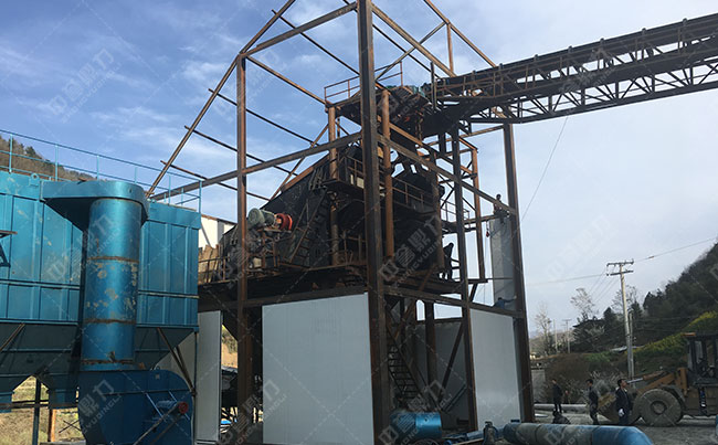 陜西省安康市平溪鎮(zhèn)時產(chǎn)500噸玄武巖生產(chǎn)線于2017年4月正式投產(chǎn)。主要配置了給料機(jī)、重錘破、錘破、制砂機(jī)、振動篩等,該配置方案適用于破碎玄武巖、石灰石等軟質(zhì)物料。且投資成本較低,生產(chǎn)的石料的粒型好看,滿足各種建筑建材。